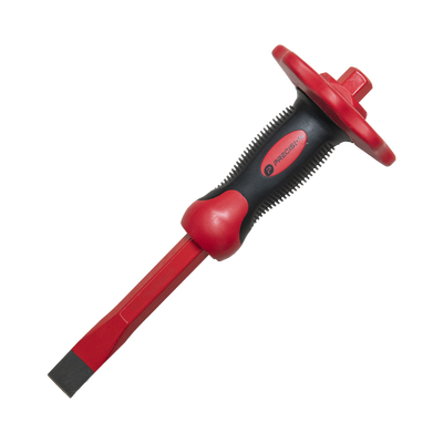 - El cincel de punta plana con protección para las manos es una herramienta imprescindible para trabajos de corte y desbaste en materiales duros como concreto, piedra y metales.